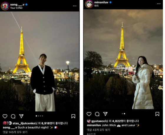 두 사람은 에펠탑 같은 배경에서 촬영한 사진을 게재했는데, 이 사진은 배경부터 촬영 위치까지 똑같아 '럽스타그램'이라는 의혹을 받았습니다.