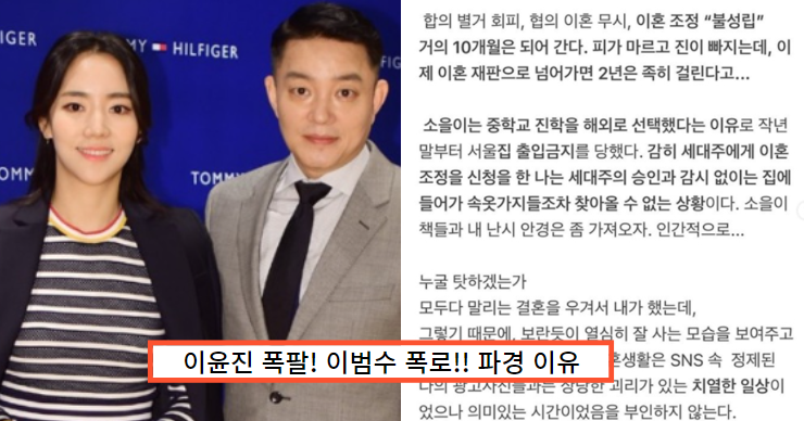 그동안 직접적이 이혼 사유나 심경에 대해 언급을 피하면서 간접적으로 표현해 오던 이윤진은 드디어 폭발합니다.2023년 3월 23일 자신의 인스타그램에 장문의 글을 올리며 이범수에 대한 폭로를 합니다.