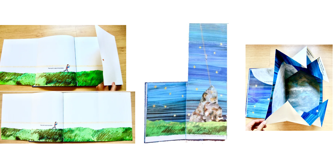 달에게 가는 아빠, 책의 접힌 부분이 펼쳐지면서 입체적으로 변합니다. 그렇게 적당히 작아진 달을 가지고 와 딸 모니카에게 전달하고 모니카는 달과 즐겁게 놀 수 있게 되었죠~