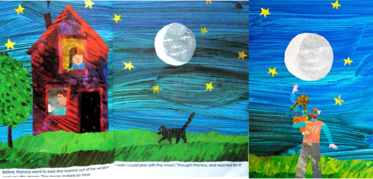 달을 보곤 아빠에게 부탁하는 모니카 아빠는 기꺼이 딸을 위해 긴 사다리를 준비해서 달을 가져다줍니다. 긴 사다리를 준비해 가져가고, 사다리를 타고 올라가서 가져가기엔 너무 큰 달에게 부탁합니다. 달은 아빠에게 난 매일 조금씩 작아지니, 적당한 크기가 되었을 때 가져가라고요.