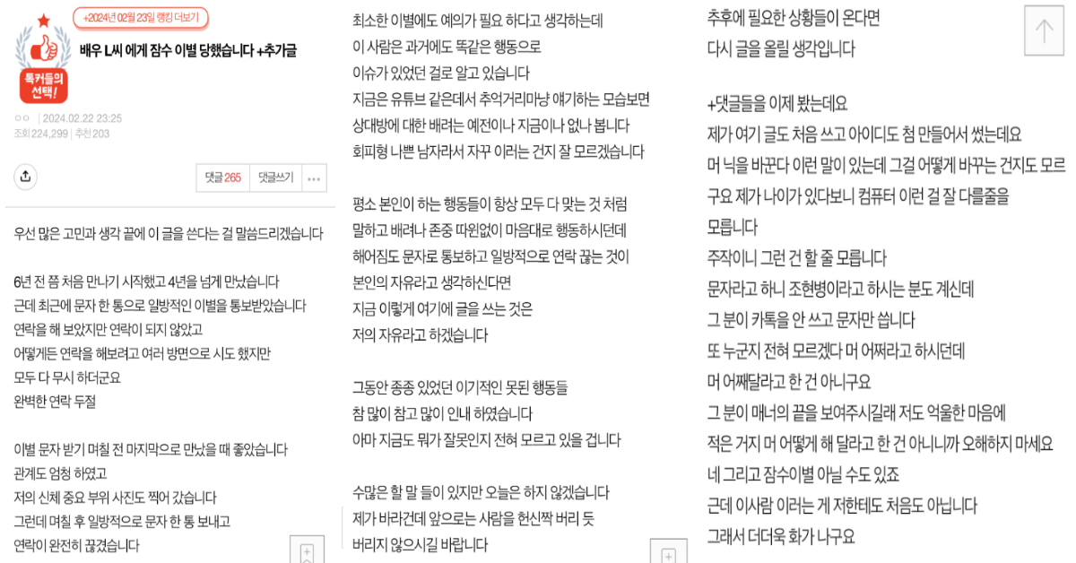 제목은 "배우 L씨에게 잠수이별 당했습니다"였습니다.
